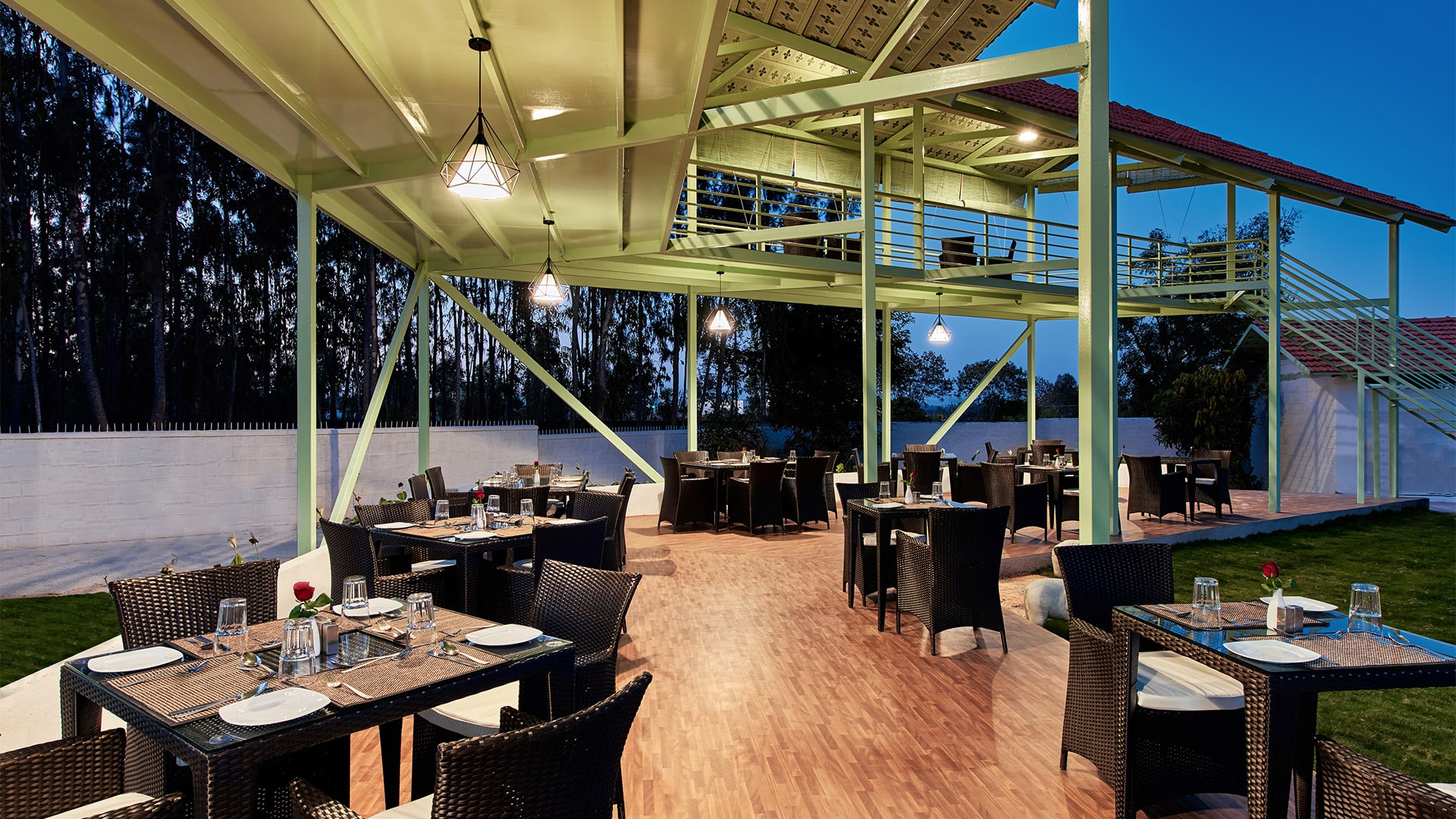 A uniquely shaped restaurant, overlooking the pool, serves irresistible Indian and Tandoori cuisine to tickle your taste buds.